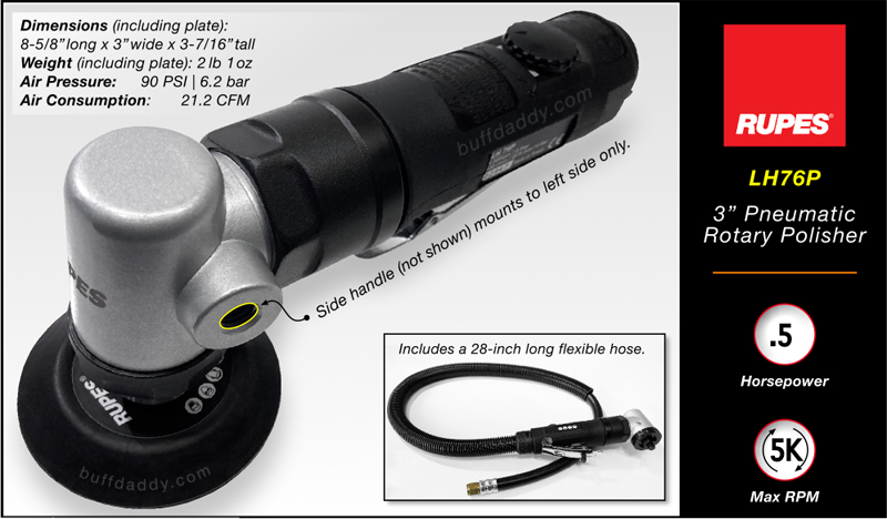 The Rupes LH76P is a rotary-action machine that spins its backing plate in a continuous circular motion. This 2-pound powerhouse delivers up to 5,000 RPM. While the LH76P's performance is quite impressive, please be aware that its air consumption can be pretty substantial, if used at maximun speed for an extended period of time.
