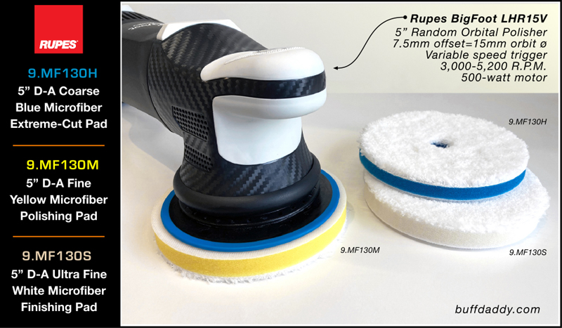 go-to pad for everyday polishing tasks. Due to its versatility, this pad is by far the most popular pad in the line. It delivers very fast-cutting action, but can also achieve a tremendous finish. For ultimate gloss when working on finicky paint types, final polish using a yellow or white Rupes foam pad, and an appropriate buffing liquid.