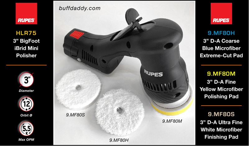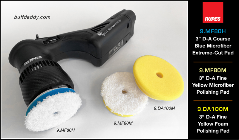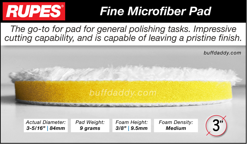 go-to pad for everyday polishing tasks. Due to its versatility, this pad is by far the most popular pad in the line. It delivers very fast-cutting action, but can also achieve a tremendous finish. For ultimate gloss when working on finicky paint types, final polish using a yellow or white Rupes foam pad, and an appropriate buffing liquid.