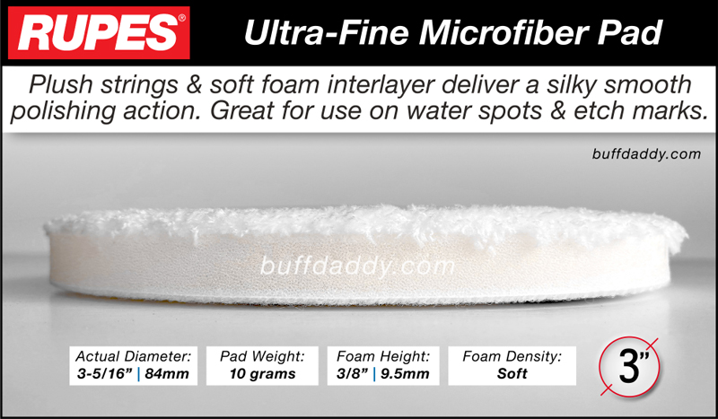 The White Ultrafine Microfiber Pad features a tall & soft foam center, and an abundance of plush microfiber strings. This pad delivers maximum comfort during use and when used with the right procedure, it excels at minimizing or eliminating water spot & bird-dropping etch marks.