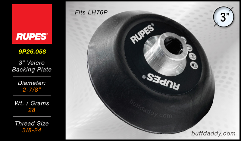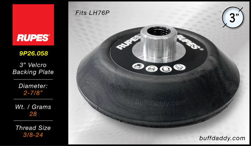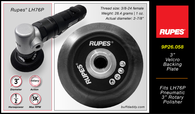 The Rupes LH76P BigFoot 3" Air-Powered Rotary Polisher is a heavy duty, well-built machine. Its 1/2 horsepower motor can deliver speeds up to 5,000 RPM, which can strain the plate's Velcro hooks. The Rupes 9P26.058 is a direct repacement for the factory installed unit. It's a good idea to keep at least one spare on hand if you own an LH76P, as they are not all that easy to locate in a pinch. Features 3/8-24 female thread. Actual diameter 2-7/8".