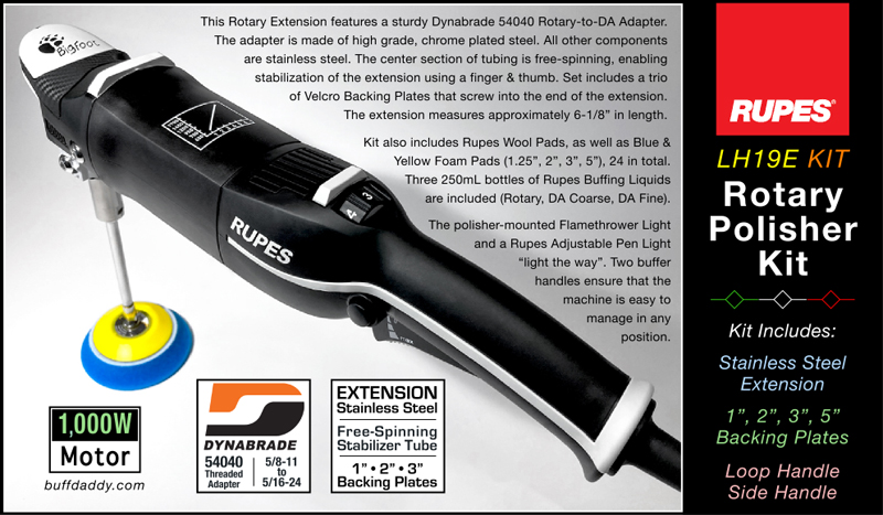 The Rupes LH19E Rotary Polisher is the foundation of this 37-Piece Polishing Kit. Its innovative polishing head (double gear reduction) amplifies torque, enabling the machine to be compact in size. The LH19E features a highly efficient 1,000-watt motor (8.5 amp, 110/120v), which delivers a maximum of 1,700 RPM. Although the LH19E's maximum speed is less than that of larger rotary machines, it is more than adequate, as today's automotive paint systems are incapable of withstanding excessive twisting force, and high levels of friction-induced heat. When partnered with the included Stainless Steel Extension Set, this machine becomes a strategic polisher. A pair of LED lights (machine mounted and handheld) ensure that nooks & crannies are properly illuminated, so that perfection can be achieved, regardless the polishing environment. Please click on the photos to access all component specifications, and more info! Rupes LH19E Rotary Polisher Set. Includes:(1) Rupes LH19E Rotary Polisher (1) 5" Velcro Backing Plate (5/8-11 thread) (1) Loop-Style Handle | (1) Side-Mount Handle (1) Polished Stainless Steel Headcap Bolts (pair) Stainless Steel Extension Set. Includes:(1) Dynabrade 54040 Adapter with Extension (1) Velcro Backing Plate Set (1", 2", 3" diameters) Rupes 24-Piece Buffing Pad Set. Includes:(8) Rupes Blue Coarse Wool Polishing Pad (8) Rupes Blue Coarse Foam Cutting Pad (8) Rupes Yellow Fine Foam Polishing Pad Rupes 3-Piece Buffing Liquid Set. Includes:(1) Rotary Coarse Polishing Compound (250mL) (1) DA Coarse Polishing Compound (250mL) (1) DA Fine Polishing Compound (250mL) Paint Polishing LED Lighting Set. Includes:(1) Rupes Swirl Finder Adjustable Pen Light (1) Buff Brite Flamethrower Professional Polishing Light Add a Rupes Embroidered Duffle Bag. Includes:(1) Rupes Embroidered Duffle Bag (save $10.40) (1) Free Rupes Screenprinted Apron (save $21.95) (1) Free Rupes Adjustable Cord Clamp (save $6.00) The LH19E Rotary Polisher carries a one-year parts and labor warranty. Rupes USA offers the industry's fairest, fastest, & finest repair service! Check it out here. Purchase this kit and save $110.00 over an already great price!