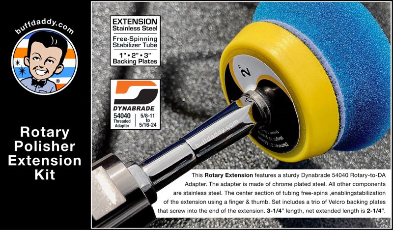 For more than two decades, my passion for the craft of polishing has inspired me to make adapters and extensions for all sorts of polishing machines. Some were made by request, while others were conjured up because I wanted to use a non-original backing plate that would not install onto a machine... or once installed, the rotating assembly would become ridiculously out of balance, requiring additional mass to restore usability. These particular extensions are built by hand, simply because I do not possess the machinery required to make them in bulk. Sizing, shaping, and polishing of components is accomplished using typical work tools. A hacksaw blade cuts lengthy threaded studs to size; hand files and a bench grinder help to rough-shape & debur hardware. Grinder-mounted cotton wheels are used to polish stainless steel hardware to a high luster. Quite often though, polishing work is accomplished using various grades of sandpaper that range in coarseness from P320 to P5000 grades. In a bit of irony... my rotary polisher serves double-duty as a handheld lathe! Although these extensions spin very close to true, they do not always spin absolutely true. This is because the threaded components used to make the extensions come from several sources. Consequently, the thread tolerances vary just enough to cause a bit of wobbling upon tightening. To combat this, each extension is assembled, and tested for trueness. If wobble is visible, the parts are loosened, minutely adjusted, and then re-tightened until the everything spins as close to true as possible. ![]() • Dynabrade® Rotary-to-DA Adapter | When installed onto rotary polishers featuring 5/8-11 thread, this adapter enables backing plates utilizing 5/16-24 thread to be screwed directly into the adapter. Instead of a backing plate, we mount a long piece of stainless steel threaded stud into the adapter, which extends the backing plate away from the machine. • Extension Rod | A stainless steel threaded stud runs the full length of the extension. Measuring only 5/16" in diameter, it is literally half the diameter of the 5/8" mounting stud protruding from typical rotary polishers. • Stabilizing Tube | A piece of free-spinning, stainless steel tubing covers the threaded stud, enabling stabilization of the extension. Simply grasp the tubing with a finger and thumb to minimize pad chatter, torque-steer, or extension wobble. • Backing Plate Mount | A conically shaped coupling nut (essentially a long nut) accepts 5/16-24 male-thread backing plates. Hand-tightening of the backing plate is sufficient to keep it securely mounted to the extension, while removal of the plate is similarly easy. No wrench needed. ![]() You'll be ready to tackle just about any polishing task if you've got a set of Rupes® Buffing Pads on hand. A strong discount is applied to the pads when purchased with this extension. Rupes Foam Pads are notoriously long lasting, and feature a flared side for maximum contouring ability (4 versions available). Rupes Wool Pads deliver for a smooth & controlled feel (2 versions available). ![]() Although the included backing plates are extremely durable, they are small in size. More often than not, replacements are purchased simply because a plate has gone-a-missing! ![]() Check out the Rupes LH19E Rotary Polisher here. ![]() Check out the Rupes LH19E 37-Piece Rotary Polisher Kit here. ![]() |