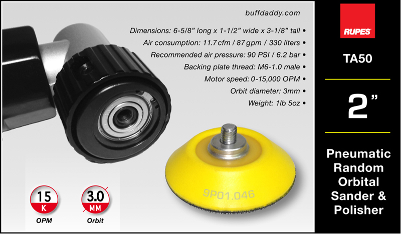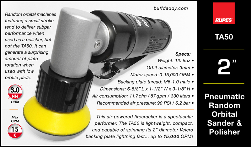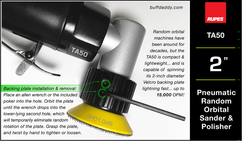 The Rupes TA50 Mini Random Orbital Sander/Polisher touts a spec sheet reminiscent of an F1 racing engine! Random orbital machines have been around for decades, but this little jewel is small, lightweight, and spins its backing plate lightning-fast... up to 15,000 RPM!